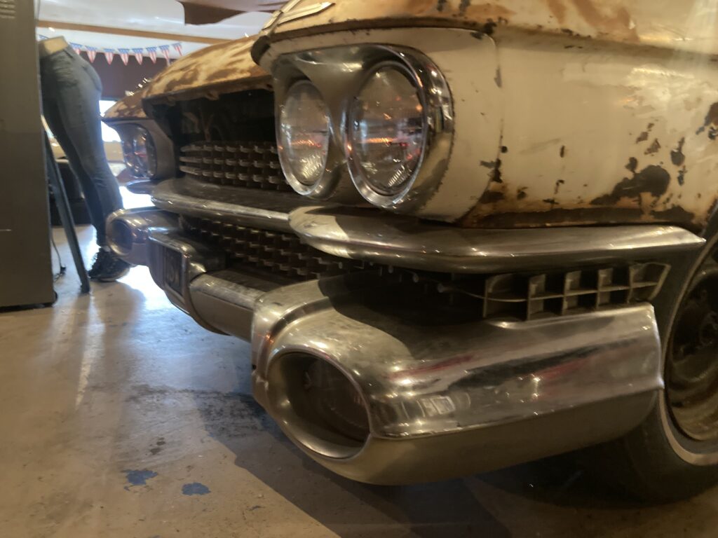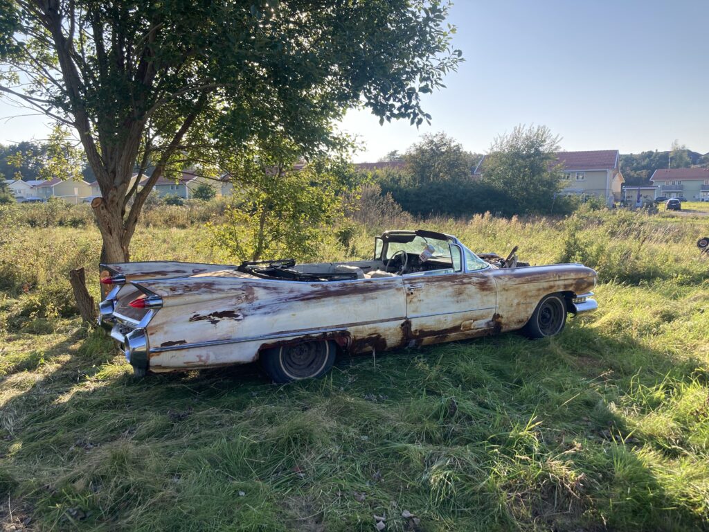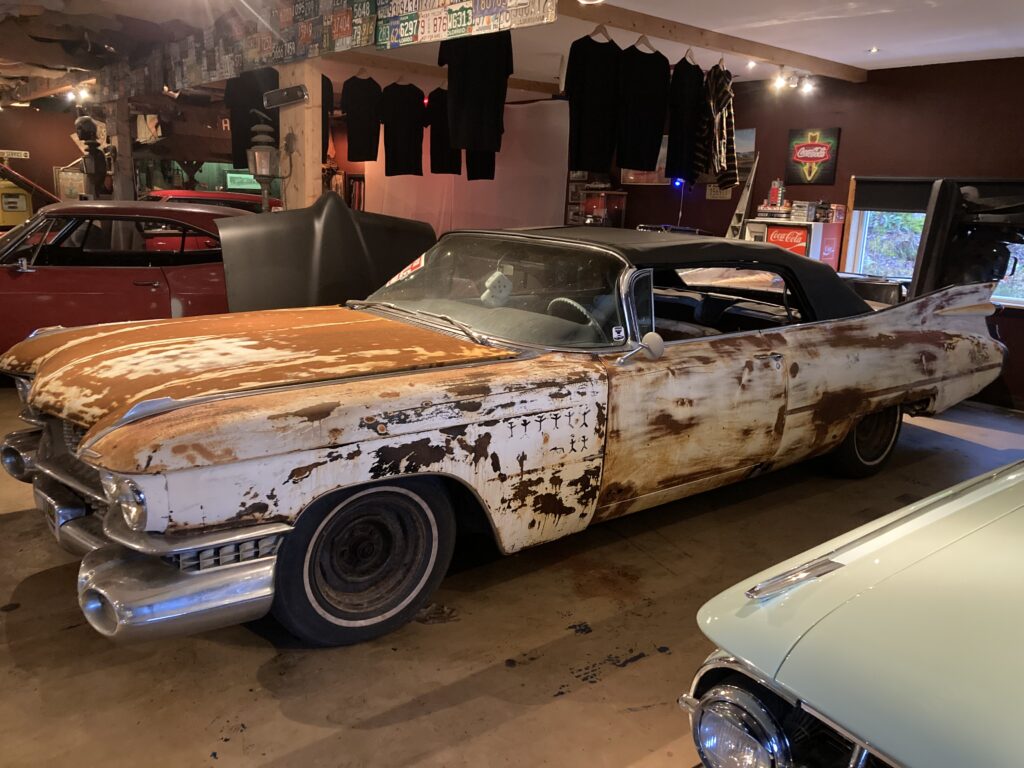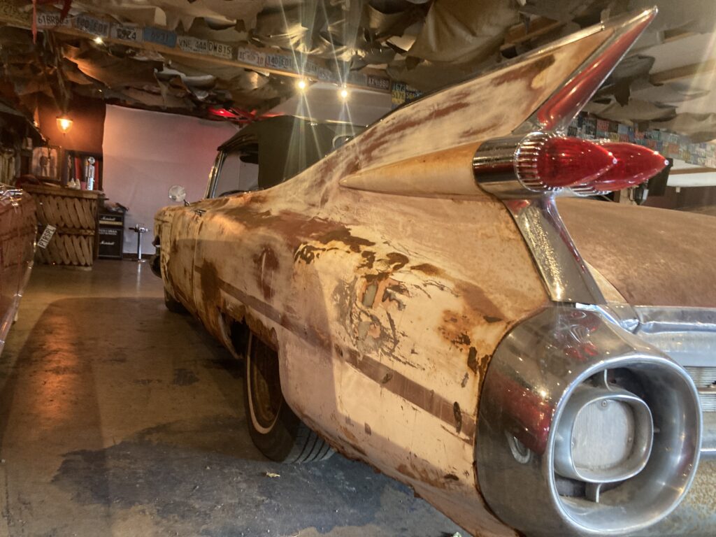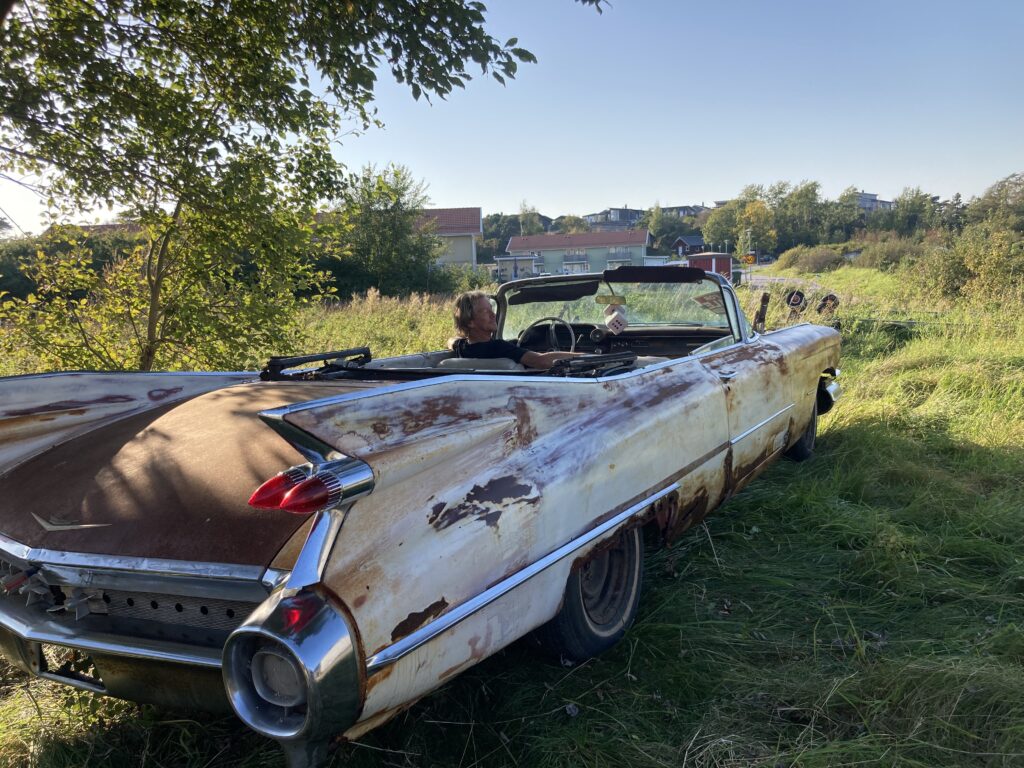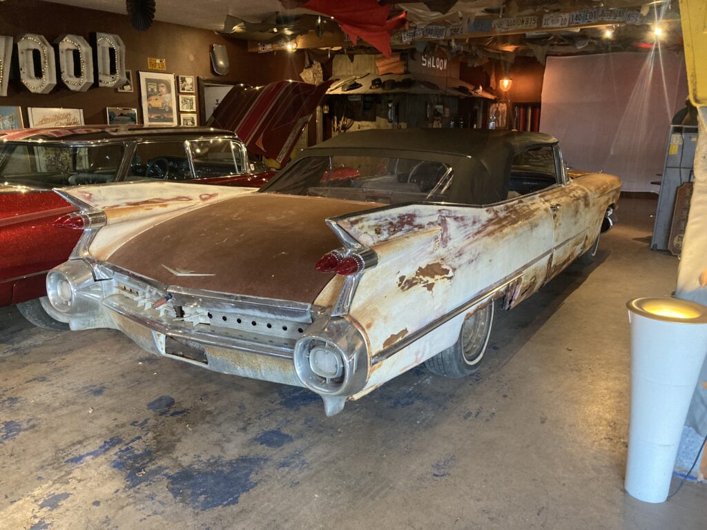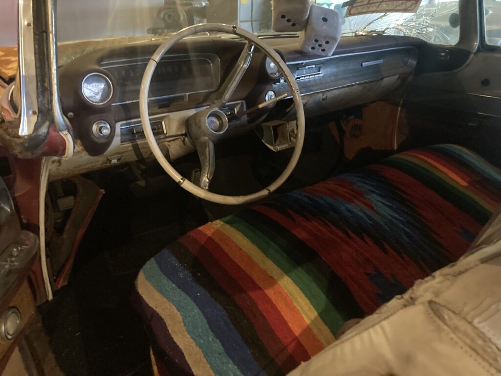 Cadillacen har tydligen varit på många platser, en annan historia är att den släpades från norra California till Pomona, motvilligt av en towtuck som krokade fast den i främre kofångaren och lyfte den så högt att den bakre skrapade i hela vägen! Den är faktist duktigt skrapad i botten…den ska även ha setts i Falköpingstrakten för ca 20 år sedan.