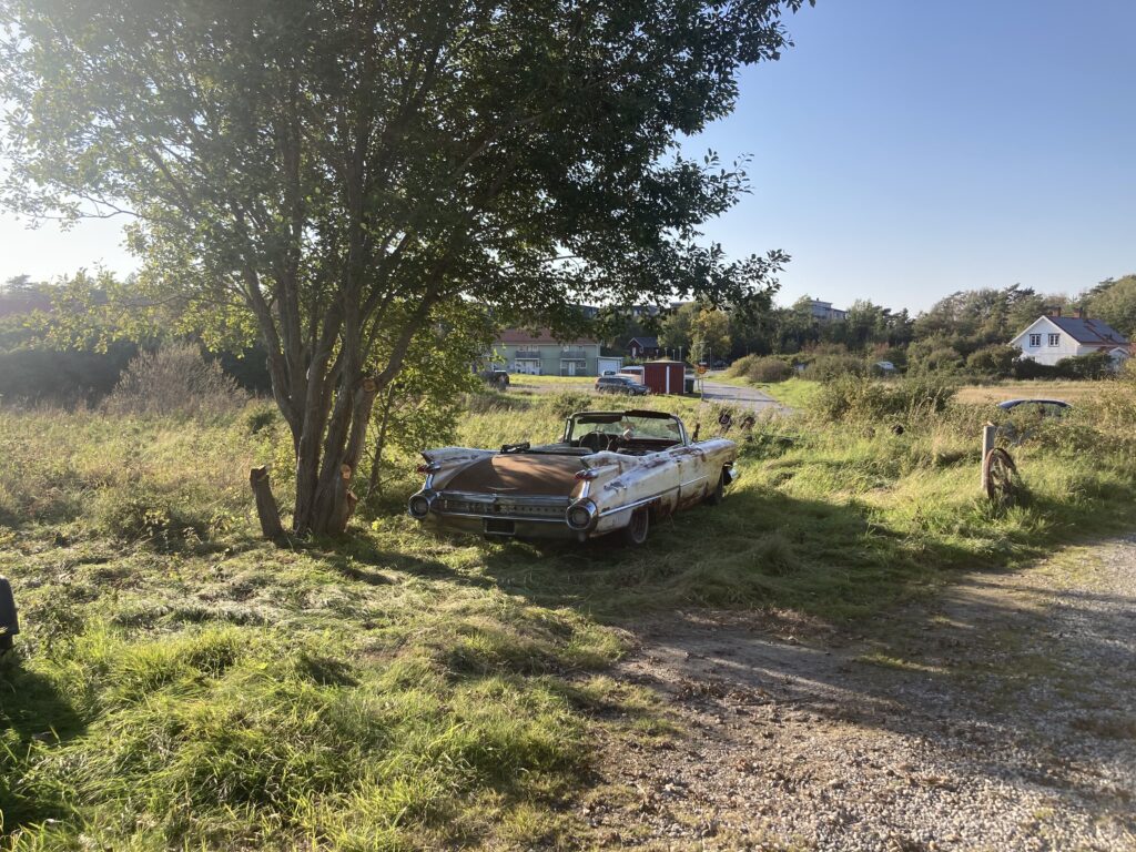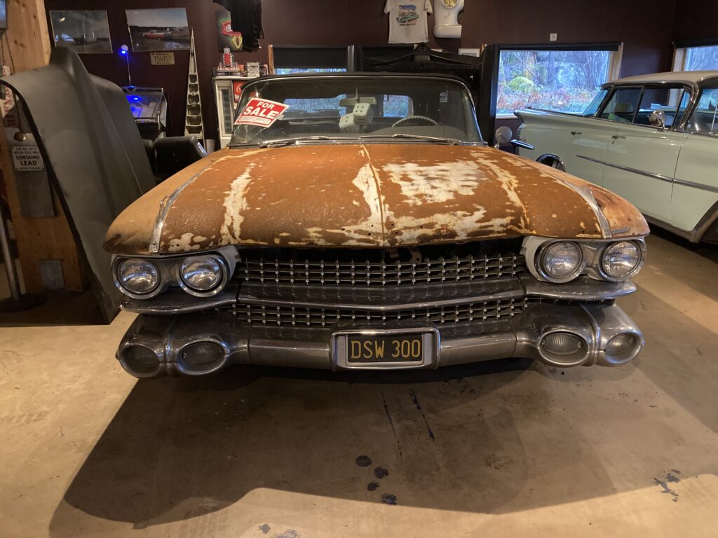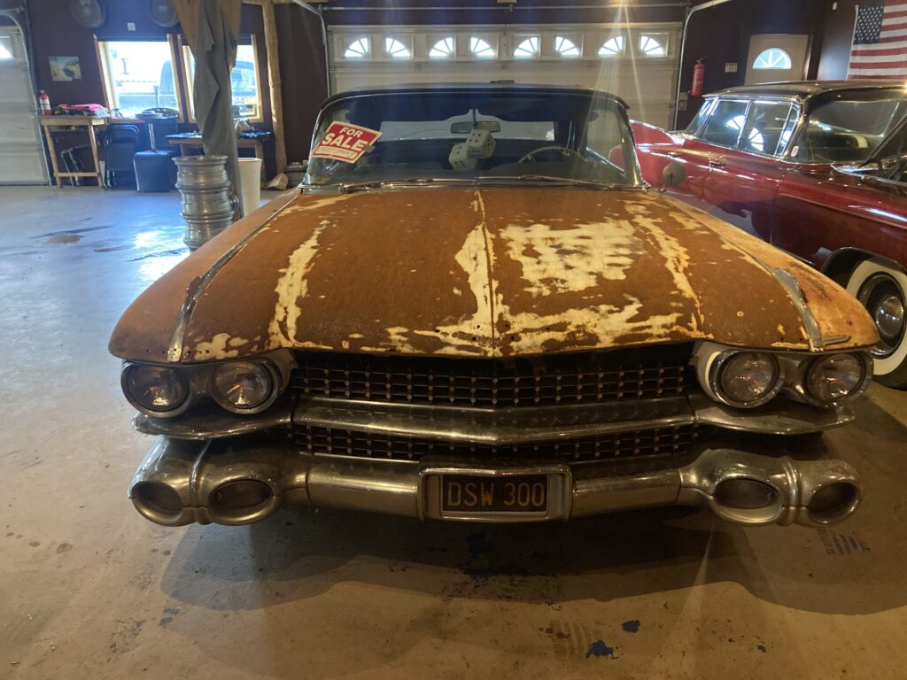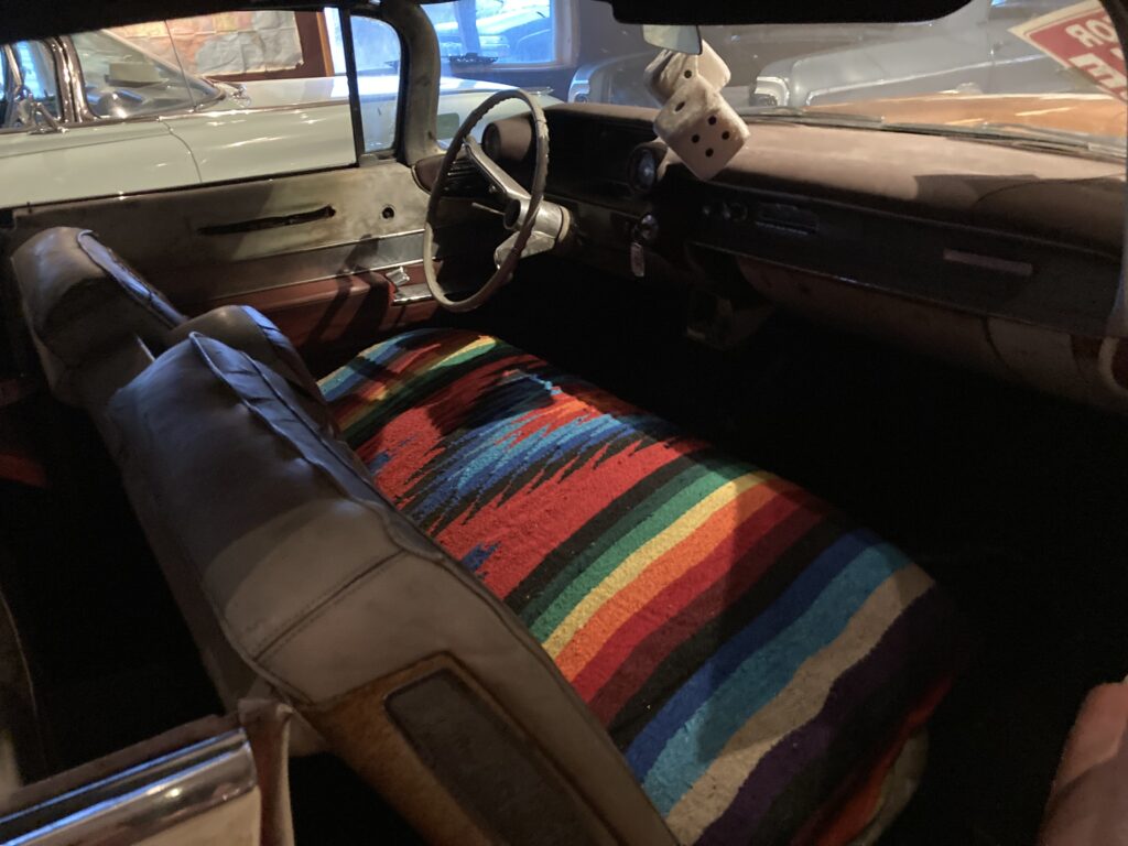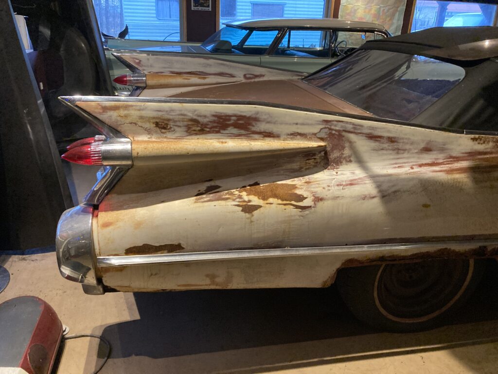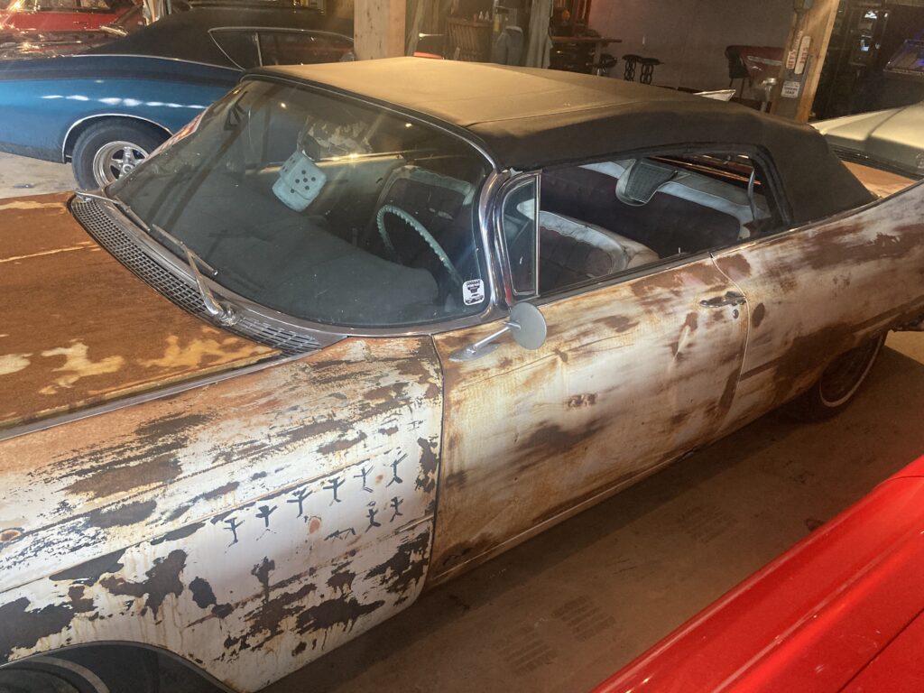 Cadillacen har tydligen varit på många platser, en annan historia är att den släpades från norra California till Pomona, motvilligt av en towtuck som krokade fast den i främre kofångaren och lyfte den så högt att den bakre skrapade i hela vägen! Den är faktist duktigt skrapad i botten…den ska även ha setts i Falköpingstrakten för ca 20 år sedan.