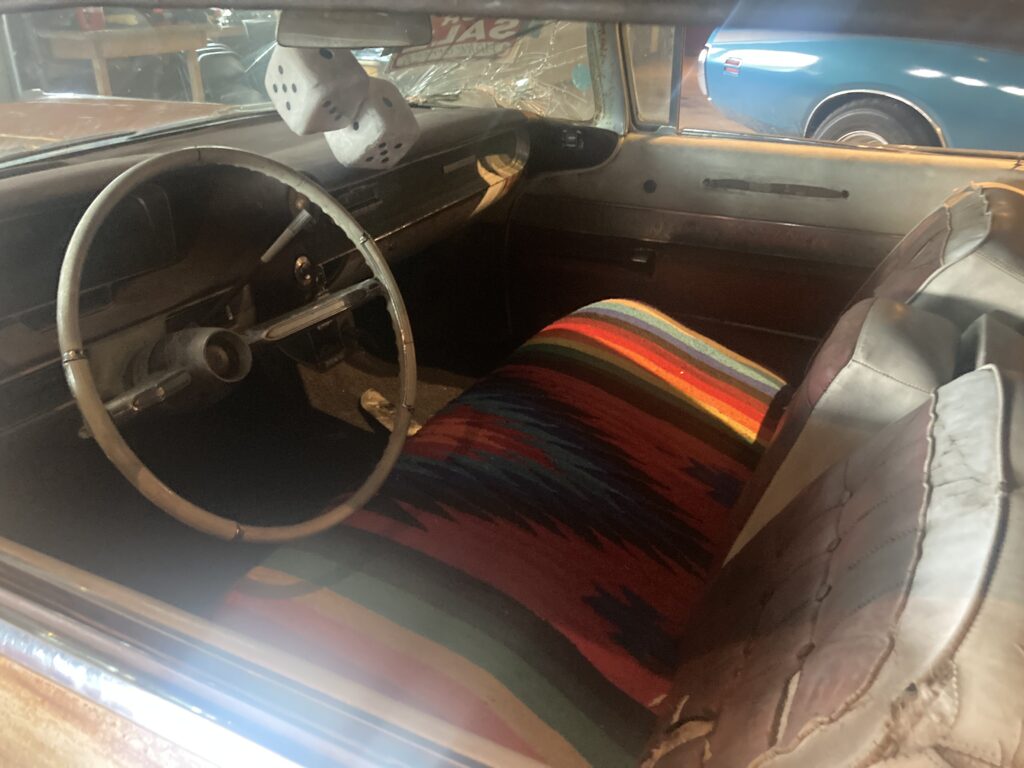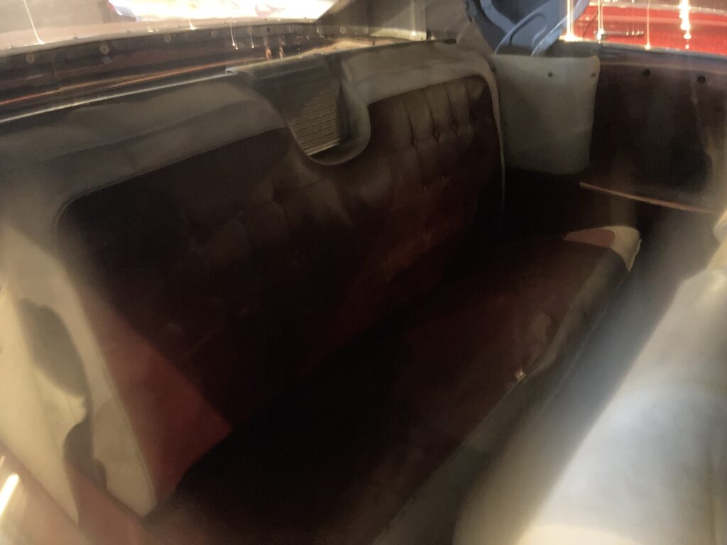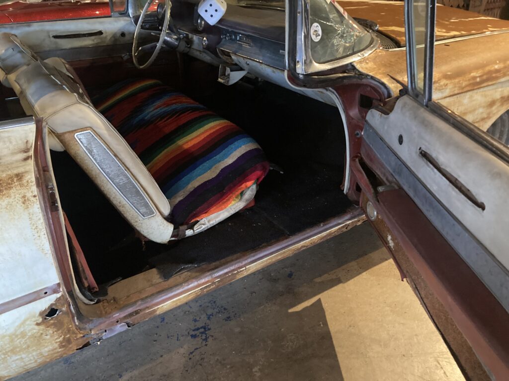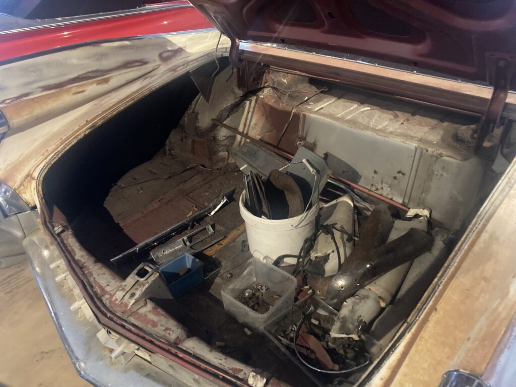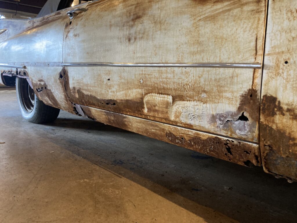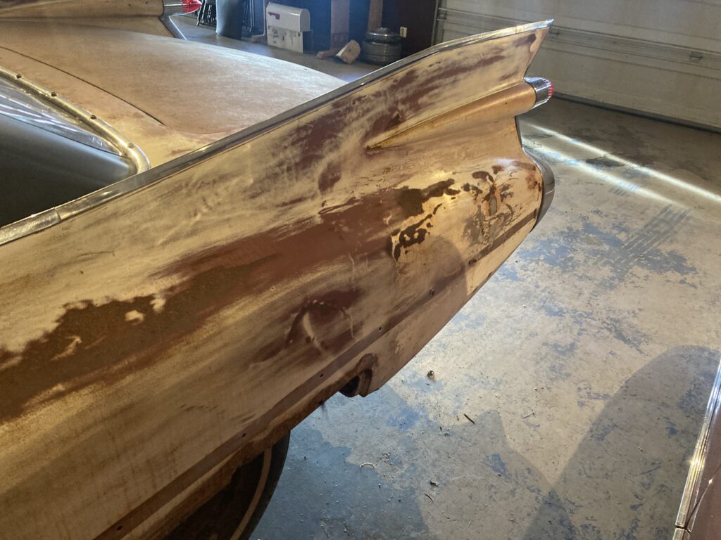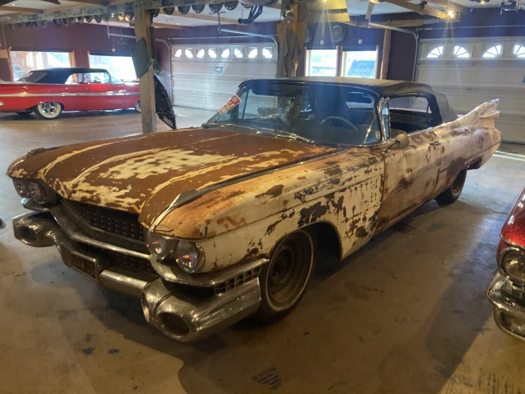 Cadillacen har tydligen varit på många platser, en annan historia är att den släpades från norra California till Pomona, motvilligt av en towtuck som krokade fast den i främre kofångaren och lyfte den så högt att den bakre skrapade i hela vägen! Den är faktist duktigt skrapad i botten…den ska även ha setts i Falköpingstrakten för ca 20 år sedan.